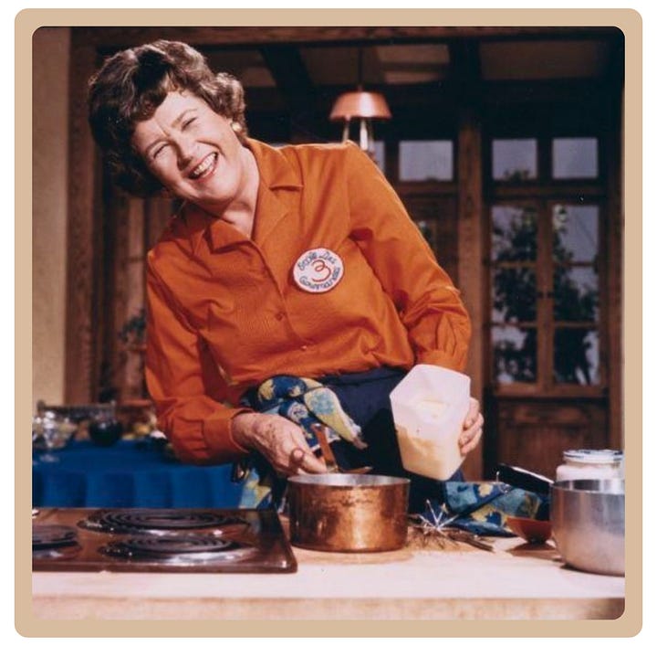 7. They regret nothing. Beloved chef, Julia Child, said, “I don’t believe in twisting yourself into knots of excuses and explanations over the food you make. When one’s host starts in with self-deprecations such as ‘Oh, I don’t know how to cook...,’ or ‘Poor little me...,’ or ‘This may taste awful...,’ it is so dreadful to have to reassure her that everything is delicious and fine, whether it is or not. Besides, such admissions only draw attention to one’s shortcomings (or self-perceived shortcomings), and make the other person think, ‘Yes, you’re right, this really is an awful meal!’ Maybe the cat has fallen into the stew, or the lettuce has frozen, or the cake has collapsed—eh bien, tant pis! Usually one’s cooking is better than one thinks it is. And if the food is truly vile, then the cook must simply grit her teeth and bear it with a smile -- and learn from her mistakes.”